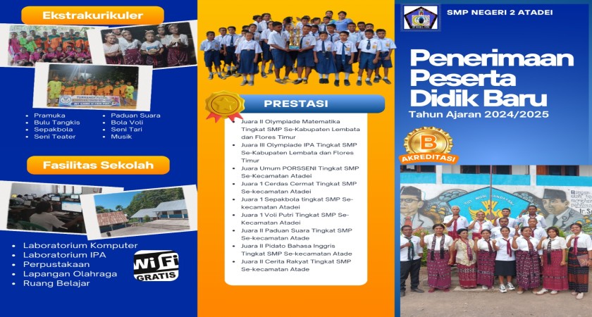 SMP Negeri 2 Atadei telah membuka Pendaftaran Peserta Didik Baru Tahun Pelajaran 2024/2024. Informasi mengenai Pendaftaran dapat dibaca dalam Brosur Berikut dan dapat menghubungi Kontak yang tersedia dalam Brosur.